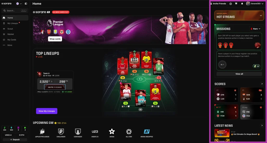 O S07 é o modo alternativo do Sorare — um formato de futebol de fantasia com sete jogadores que oferece mais flexibilidade, mas não paga dinheiro diretamente. Em vez disso, ele recompensa os melhores jogadores com novas cartas, Essence (moeda do jogo) e créditos de mercado.