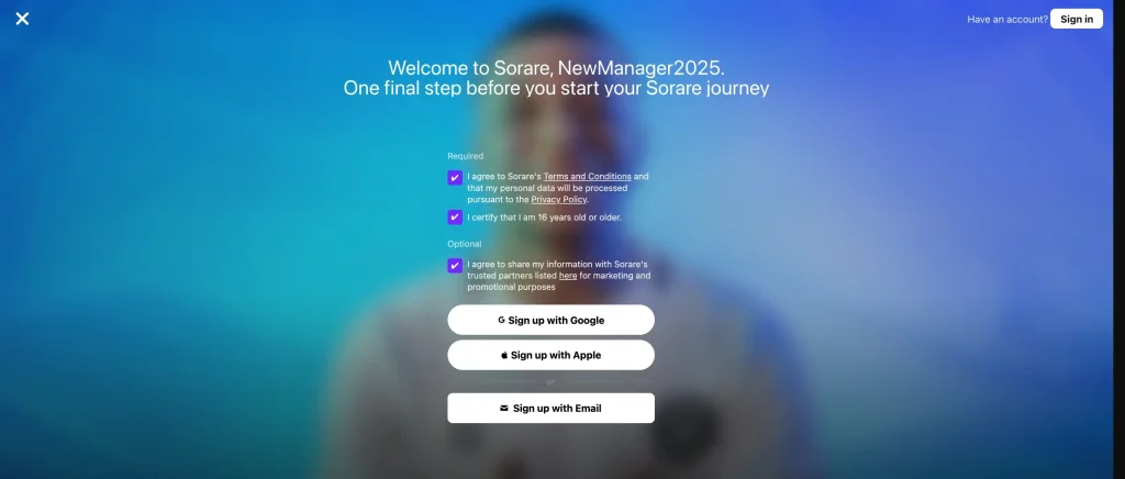 - Confirmar que tem 16 anos ou mais (sim, existe uma idade mínima para jogar Sorare)