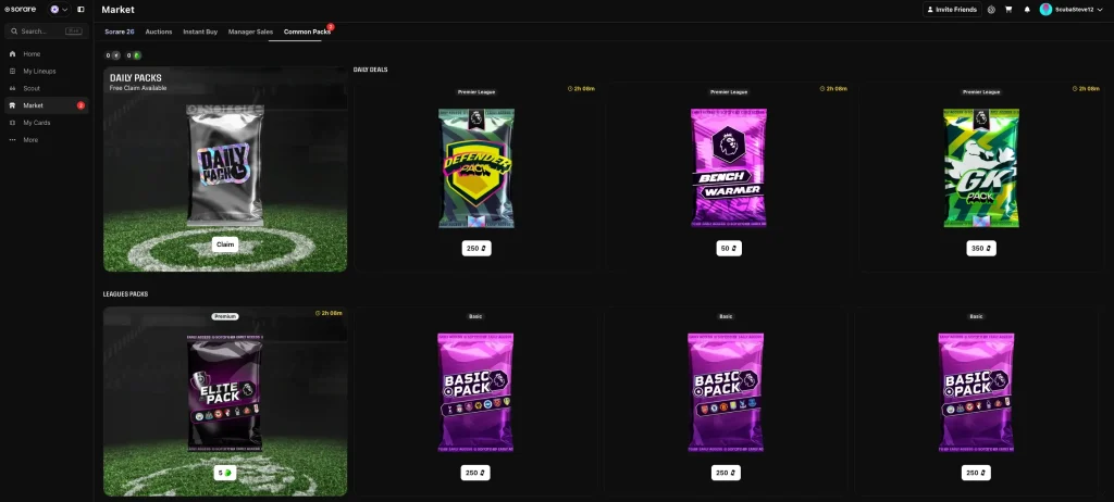 5: Dependendo do desempenho do seu time no ranking, você ganhará itens do modo gratuito — Gemas e/ou Essence. Com eles, poderá melhorar seu time escolhendo entre diversos pacotes do Sorare disponíveis. Além disso, como jogador gratuito, você receberá um Pacote Diário gratuito por dia com um jogador adicional.