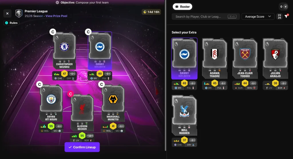 4: Monte sua primeira escalação gratuita de 5 cartas: um goleiro, um defensor, um meio-campista, um atacante e um jogador extra que pode ser de qualquer posição de linha. Quando estiver pronto, clique em “Confirm Lineup”.